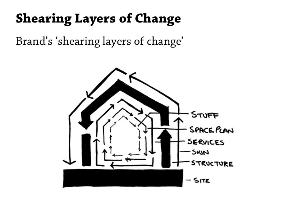 It seems that, in this particular community, Actor Network Theory is flavour of the day and it does seem to be yielding insights. As the theme of the workshop was design orientations towards a ‘building as project’ view and, never one to hoist my methodological flag on any particular pole, I attempted to argue for a conceptual linking of Ingold’s taskscape (which underpinned his ‘as project’ view), Brand et al.’s Long Now, Brand’s prior ‘shearing layers of change’ work, and kinematics (but with movement conceived temporally rather than spatially). All of this allows, I think, a new conceptualisation of buildings as constantly shifting entities that need to be nurtured, rather than conserved (or even preserved) over time. They can be thought of as animated; of having the animacy and constant ‘becoming’ (rather than simply ‘being’) that (the few) Architects seeing modality emphasise.