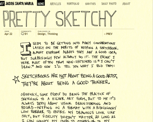 I might be in love with the design for Jason Santa Maria’s latest article, “Pretty Sketchy”. Everything that can be, from the article’s text to the navigation to the logo, is in a sketchbook style. And he’s right: